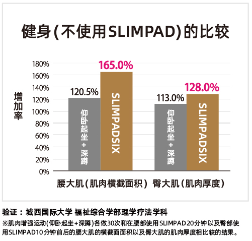 不使用SLIMPAD做30次仰卧起坐和在腹肌上使用20分钟SLIMPAD。对肌肉的收缩程度(肌肉的横截面面积以及肌肉厚度)进行比较。结果表明使用SLIMPAD SIX能产生跟一般的肌肉锻炼同样的效果甚至高于一般的肌肉锻炼。轻薄无线可以在工作或者家务时使用,不用在意时间轻松进行身体塑形。