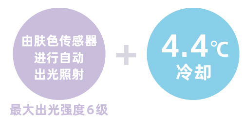 约0.8秒对肤色进行检测从而进行自动打光的肤色传感器,和接入电源后瞬间冷却的蓝宝石冷却相结合,敏感的部位和高能量的出光也不会感觉到热和疼痛,轻松进行护理。在自己的家里也能感受到跟美容沙龙同等级的效果。